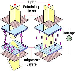 A Liquid Crystal Display (LCD) consists of two substrates that form a "flat bottle" that contains the liquid crystal mixture. The inside surfaces of the bottle or cell are coated with a polymer that is buffed to align the molecules of liquid crystal. The liquid crystal molecules align on the surfaces in the direction of the buffing. For Twisted Nematic devices, the two surfaces are buffed orthogonal to one another, forming a 90 degree twist from one surface to the other, see figure below.