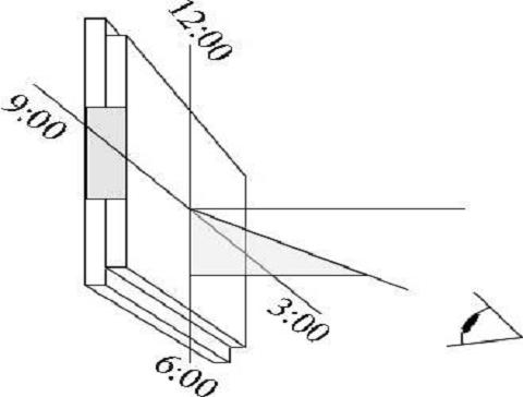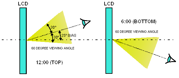 液晶显示屏的可视角度包括水平可视角度和垂直可视角度两个指标,水平可视角度表示以显示屏的垂直法线(即显示屏正中间的垂直假想线)为准,在垂直于法线左方或右方一定角度的位置上仍然能够正常的看见显示图像,这个角度范围就是液晶显示屏的水平可视角度;同样如果以水平法线为准,上下的可视角度就称为垂直可视角度。一般而言,可视角度是以对比度变化为参照标准的。当观察角度加大时,该位置看到的显示图像的对比度会下降,而当角度加大到一定程度,对比度下降到10∶1时,这个角度就是该液晶显示屏的最大可视角。正常的视角是6点或12点,9点和3点钟方向比较少被用到。